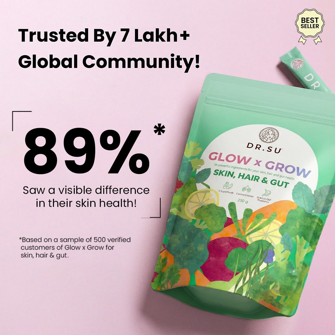 Glow x Grow calms internal inflammation through clinically dosed probiotics, vitamins, minerals, fiber, antioxidants & adaptogens.
